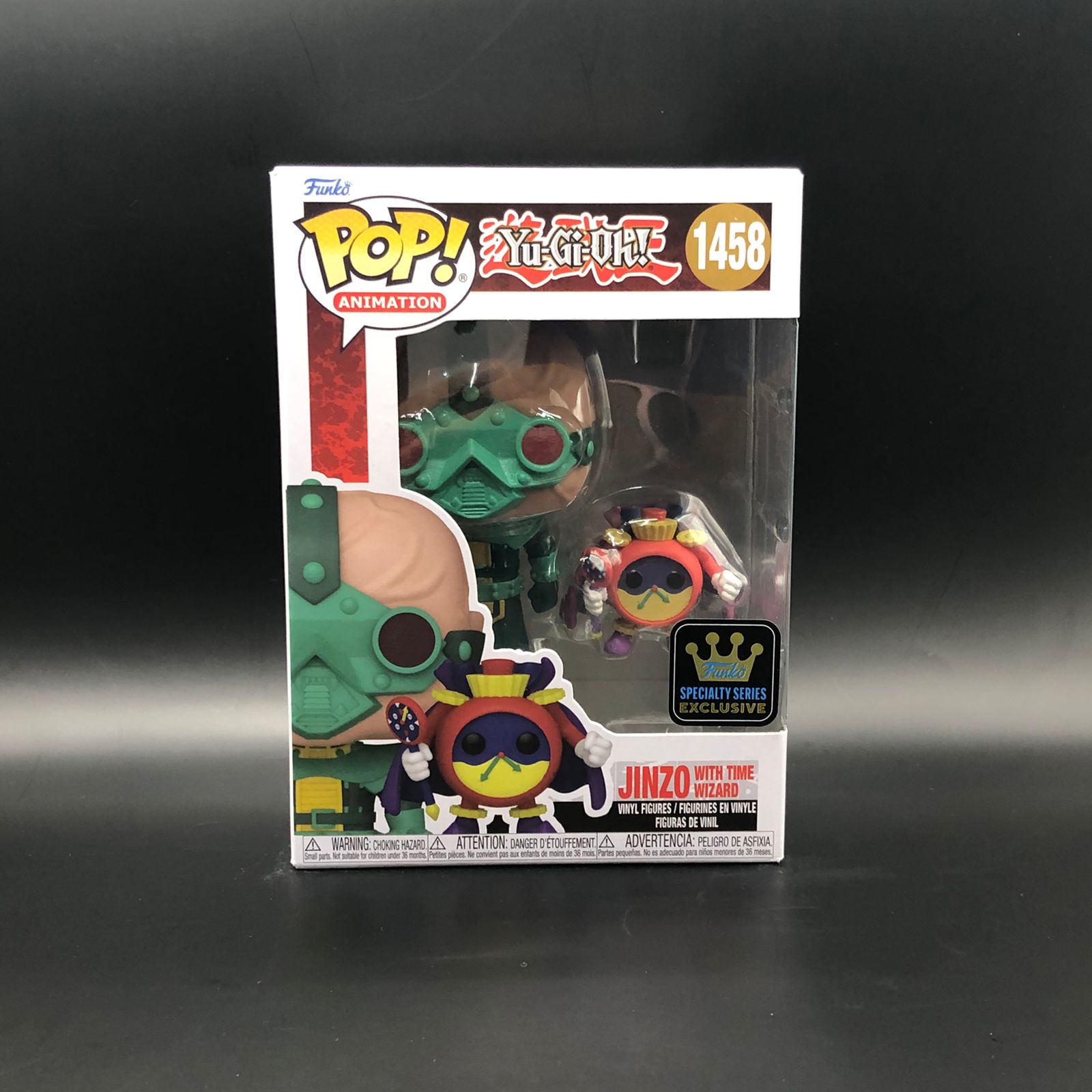 💬 Enviar pedido por WhatsAppFunko Pop de Jinzo con el Mago del Tiempo de la serie Yu-Gi-Oh!. El Funko Pop está dentro de su caja, que tiene una etiqueta de "Specialty Series Exclusive". El Funko Pop de Jinzo tiene una máscara verde y un traje con detalles amarillos, mientras que el Mago del Tiempo es una figura circular con un sombrero de mago. La caja también tiene una advertencia de peligro de asfixia.