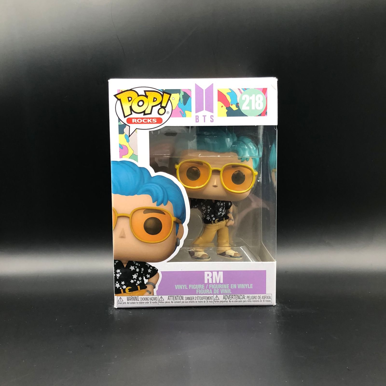 💬 Enviar pedido por WhatsAppFunko Pop de RM de BTS, con el número 218 en la caja. El Funko Pop representa a RM con cabello azul, gafas amarillas y una camisa negra con estrellas blancas, y pantalones amarillos. La figura se encuentra dentro de una caja de presentación con el logotipo de "Pop! Rocks" y el nombre "RM" en la parte inferior.