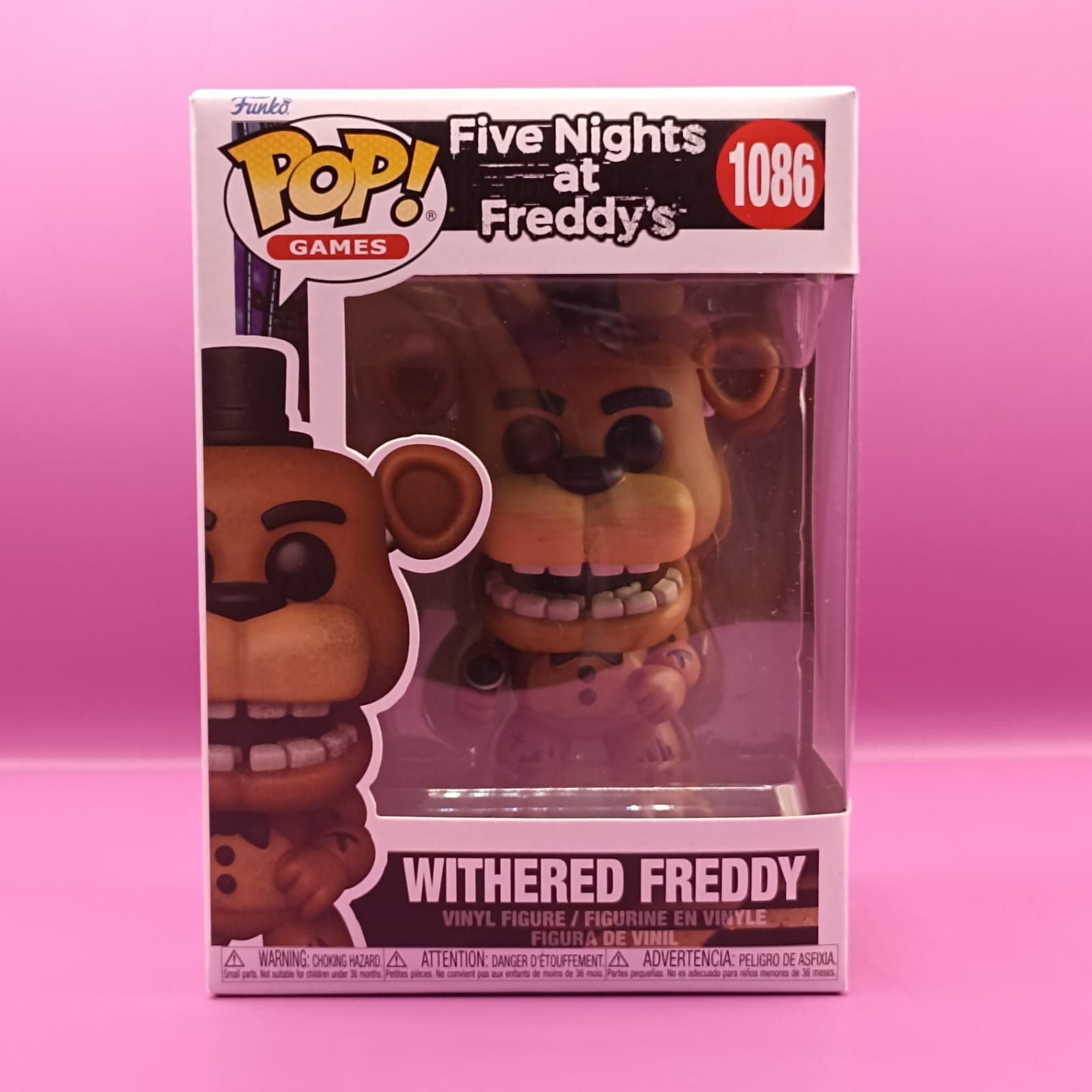 La figura Funko Pop en la imagen es de Withered Freddy, número 1086, de la colección Five Nights at Freddy's.