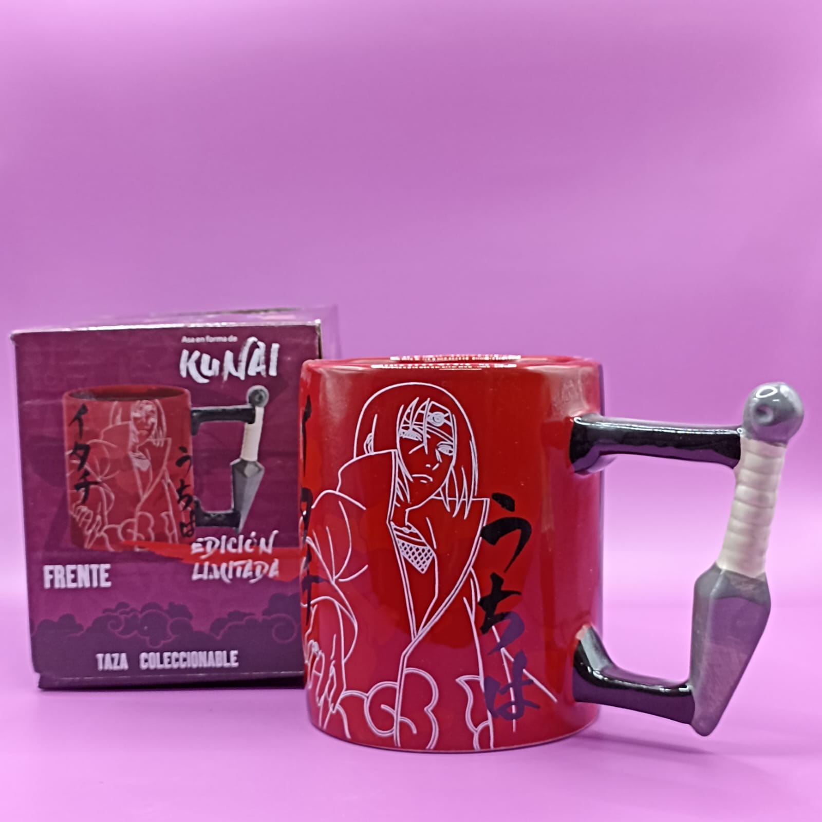 - La taza es de color rojo con detalles en blanco y negro, y viene en una caja que también muestra el diseño y el asa en forma de kunai.